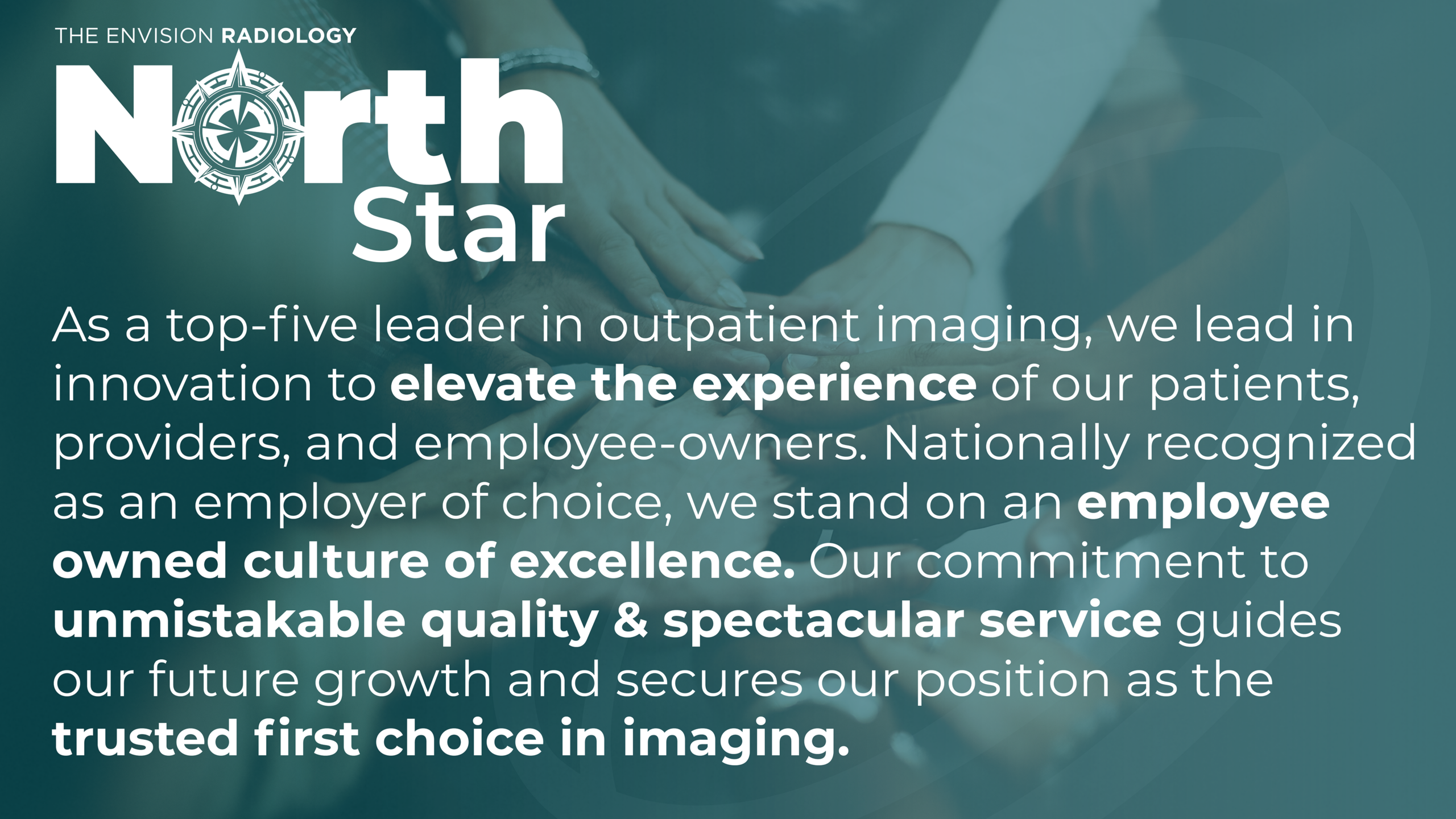 This partnership is more than an acquisition—it’s a Partnership in Purpose. Together, we’re uniting two organizations driven by a shared mission: improving lives through unmistakable quality and spectacular service. By joining as one team of employee-owners, we are building a stronger, more compassionate, and more connected future for our patients, our communities, and one another. As a top-five leader in outpatient imaging, we lead in innovation to elevate the experience of our patients, providers, and employee-owners. Nationally recognized as an employer of choice, we stand on an employee-owned culture of excellence. Our commitment to unmistakable quality & spectacular service guides our future growth and secures our position as the trusted first choice in imaging.Our North Star