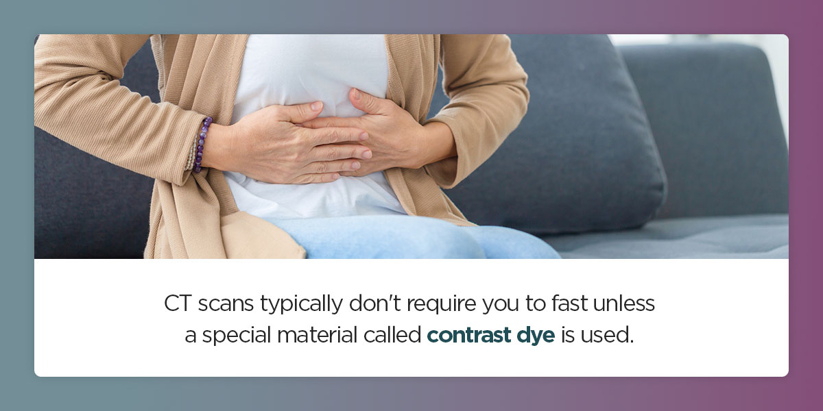 CT scans typically don’t require you to fast unless a special material called contrast dye is used. Contrast agents help enhance the visibility of the body during imaging. They usually consist of iodine, gadolinium or barium.